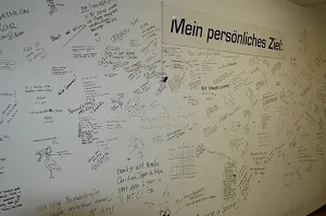 Wir haben unsere Kunden dazu eingeladen, ihr persönliches Ziel mit schwarzem Filzstift auf die Wand zu schreiben. Mittlerweile ist die Wand voll mit Zeichnungen, Texten und positiven Bemerkungen. Es macht wirklich Freude, die Texte auf der Wand zu studieren.