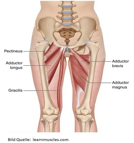 Die Muskelgruppe auf der Innenseite deines Oberschenkels nennt man auch die Adduktorengruppe (m.adductor Longus, m.adductor brevis, m.adductor magnus, m.pectineus und die m.gracilis). Der Verlauf der Muskelpartie läuft vom Schambein zur Innenseite des Oberschenkels. Die Hauptfunktion dieser Muskelgruppe ist die Adduktion (heranführen) des Oberschenkels zum Hüftgelenk.