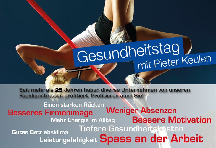 Es geht dabei unter anderem um Themen wie einen gesunden Rücken, Ergonomie, Ernährung, Gesundheitschecks direkt in deinem Unternehmen, Teambuilding-Events und vieles mehr.